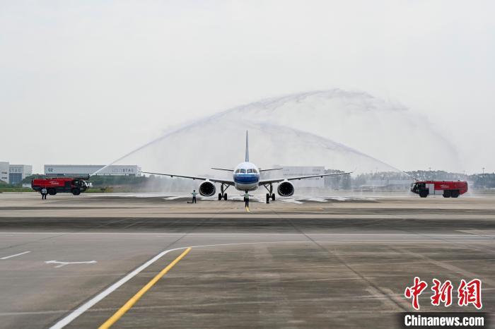8月29日,南航首架C919飞机落地广州白云国际机场时,受到航空界的最高礼仪“水门礼”迎接。中新社记者 陈骥旻 摄