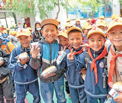 在西藏那曲市班戈县中石化小学,学生手拿营养餐等待放学。新华社记者 丁增尼达摄