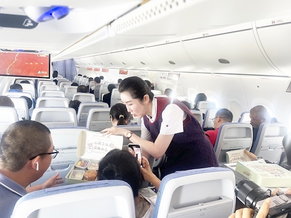 此外,国航C919在每个座椅上都配备了高功率的USB-C充电口,满足旅客手机、平板和电脑的充电需求。同时,国航也是首家在C919飞机上实现舱内Wi-Fi功能的航空公司。