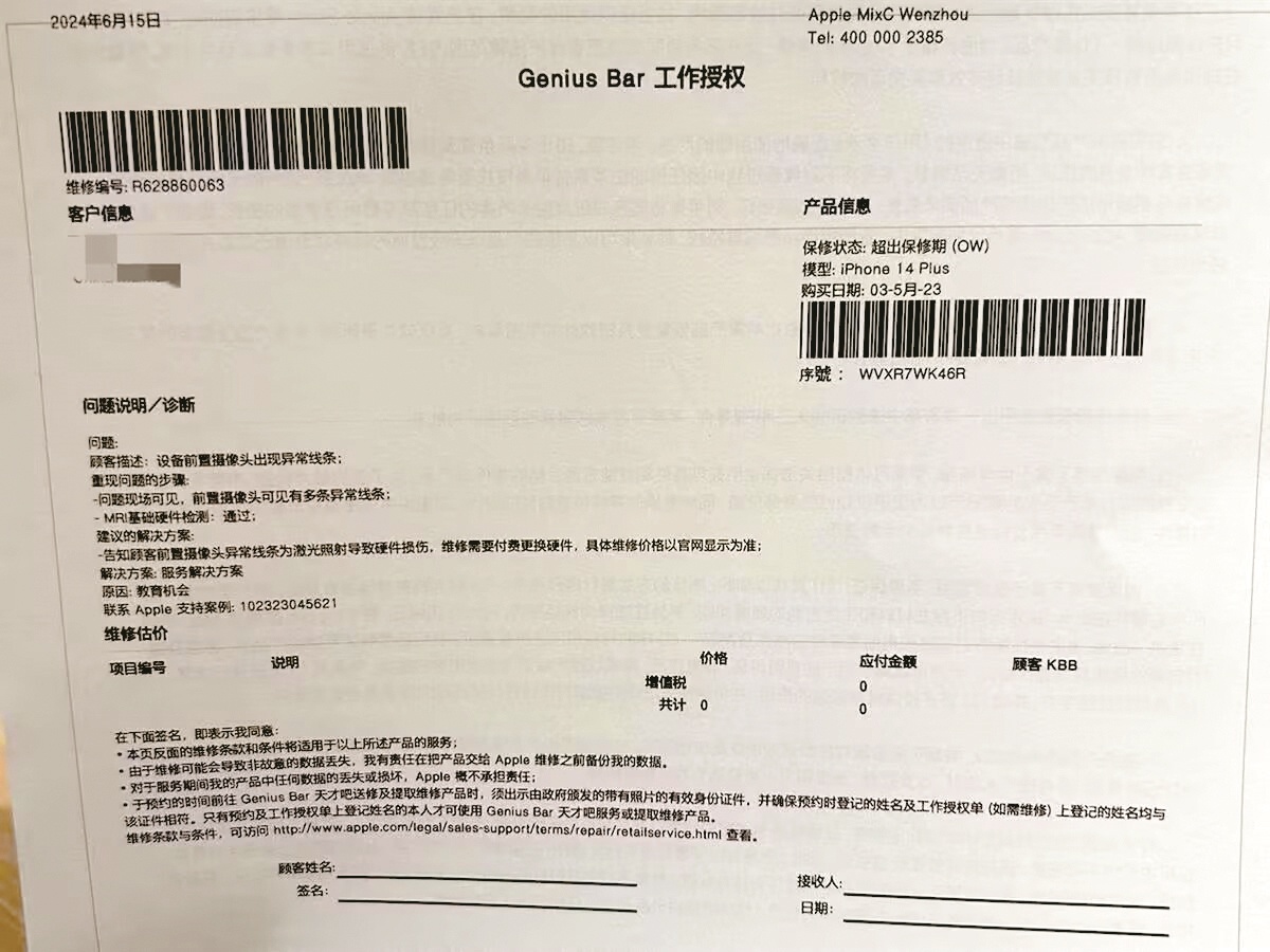 发现上述问题后,5月27日,几人联系到店长,试图协商索赔。丁女士告诉记者,此时店长否认摄像头损坏与店内激光有关,不愿承担赔偿责任。为形成完整证据链,6月3日,丁女士等几人联系手机供应商开具检测报告,根据报告所示:“前摄像头紫斑问题由激光设备所致,被激光灼伤等行为属于个人行为,不予以保修,费用为1949元/台。”