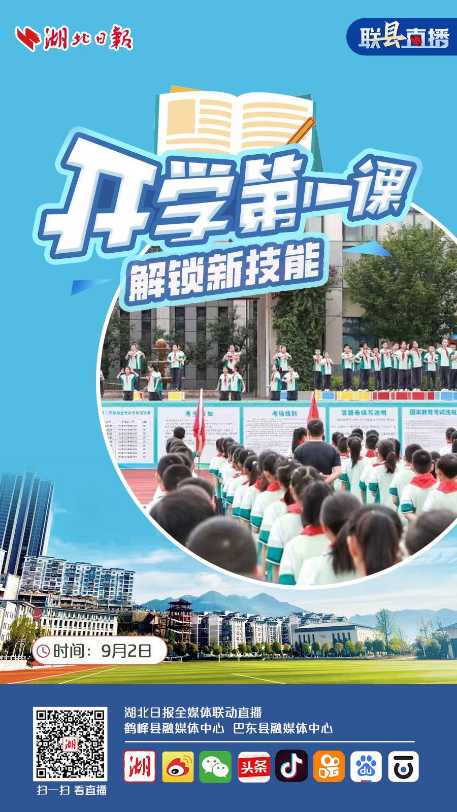 湖北日报联动鹤峰县融媒体中心、巴东县融媒体中心,分别走进鹤峰县思源实验学校、巴东县神农中小学,一起去看看他们的开学第一课,都有哪些精彩的内容,同学们又会在课堂内解锁哪些新技能,迈进湖北日报直播间,一起来上新学期的第一课吧。