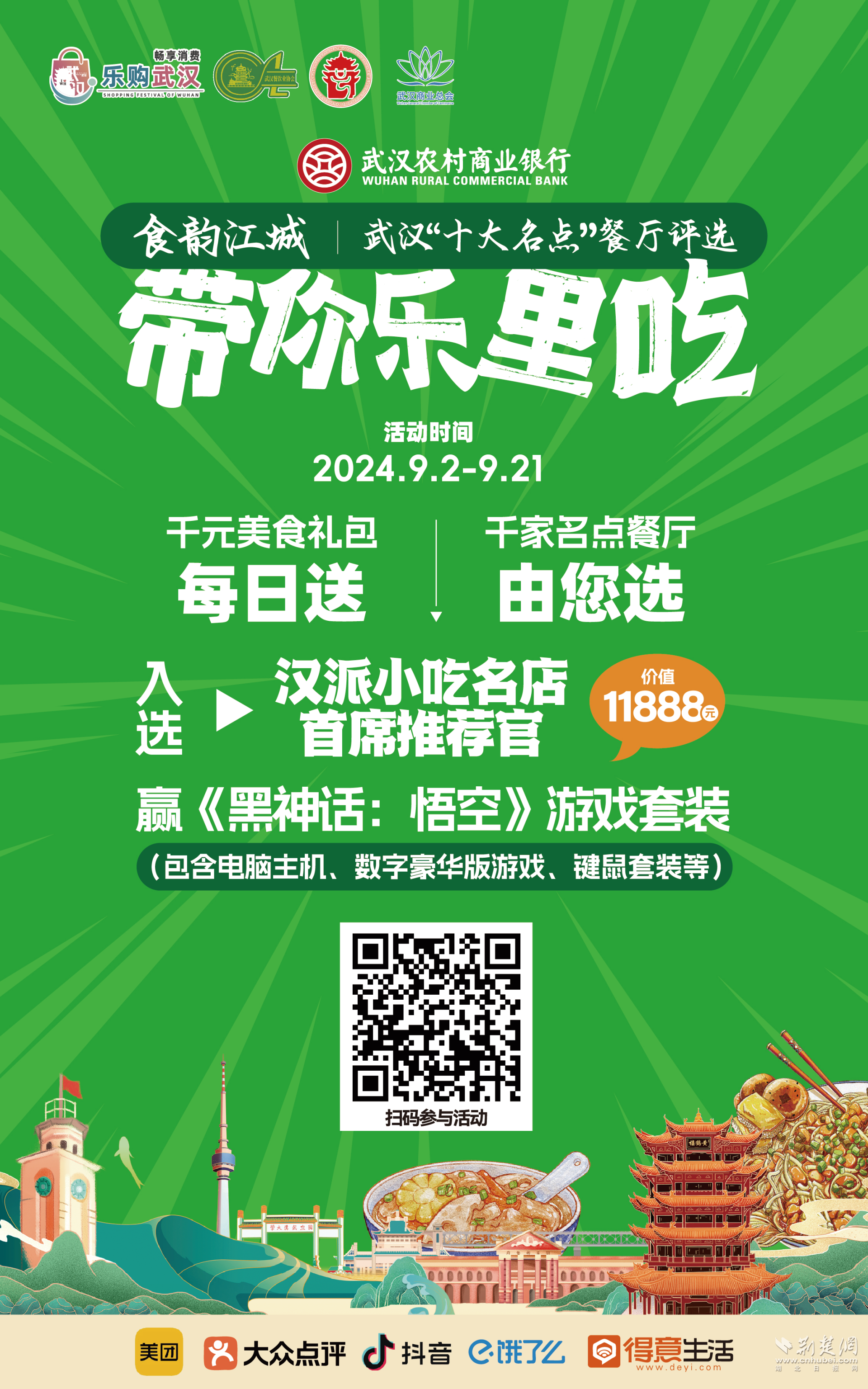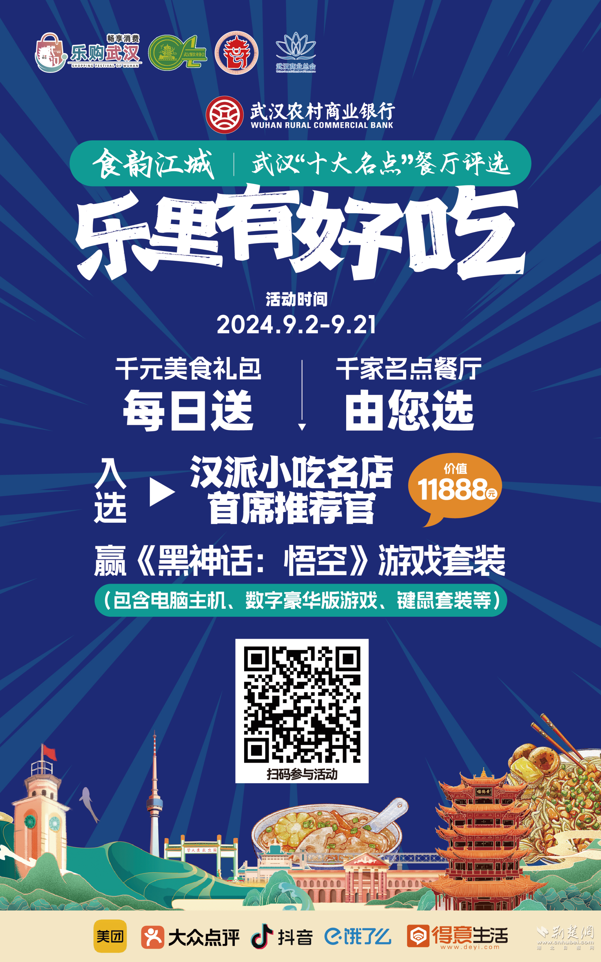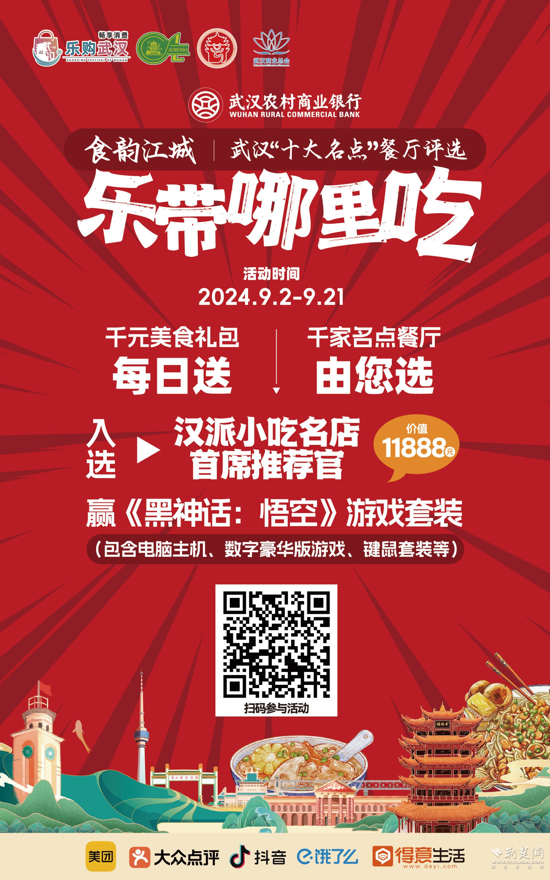 在“早餐之都”的武汉,往往被各式小吃迷了眼,“乐带哪里吃?”成为灵魂拷问。作为武汉“十大名菜、十大名点”推广活动的重头戏,9月2日9:00开始到9月21日24:00,食韵江城——武汉“十大名点”餐厅评选进入为期20天的投票阶段,乘坐地铁,逛商业街,或在门店进餐,您都可以通过扫描活动宣传海报上的二维码进入H5投票小程序,为心仪的宝藏餐厅投票,给出“带你乐里吃”、“乐里有好吃”的答案。