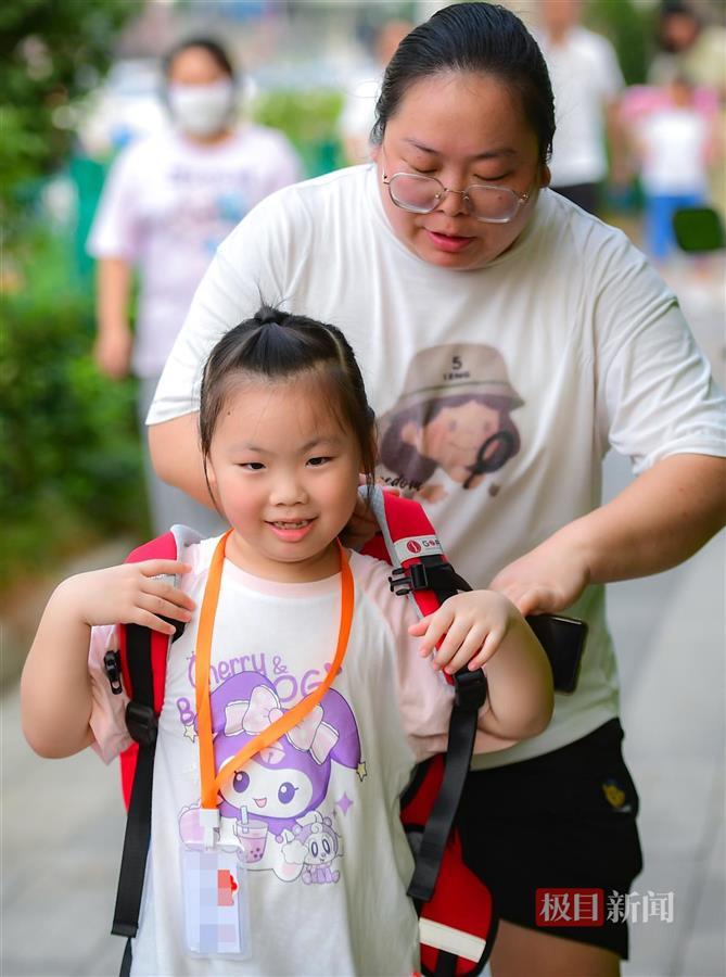 武昌新河街学校,一位学生妈妈在给小朋友整理书包