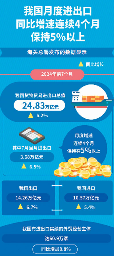 今年前7个月,中国货物贸易进出口规模创历史同期新高,外贸经营主体持续活跃。