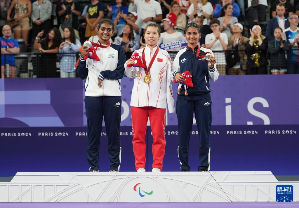 9月2日,冠军中国选手杨秋霞(中)、亚军印度选手穆鲁盖桑(左)与季军印度选手拉马达斯在颁奖仪式上。新华社记者 才扬 摄