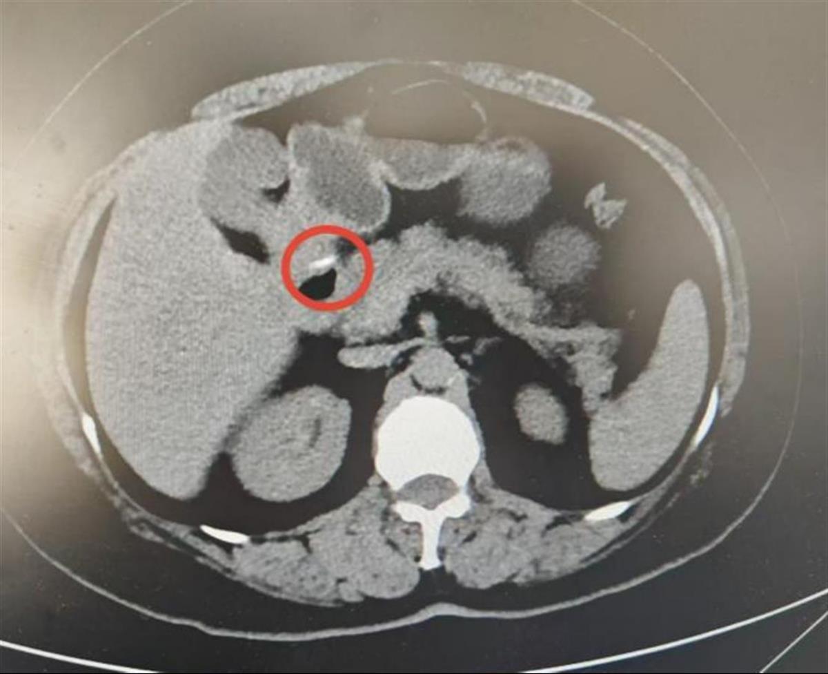 一个月前,60岁的王女士(化名)在吃饭时不慎误吞了鱼刺,她连吞了几口饭,试图将卡住的鱼刺咽下去,直到喉咙没有异物感。一周后,她突然出现剧烈腹痛、发热等症状,于是来到协和医院就诊。经腹部CT检查发现,有一根刺状条形异物穿透了胃后壁,部分位于壁外,显然是出现了胃穿孔。如果不及时取出,可能会穿透胃后方的胰腺,引发内出血、胰液性腹膜炎等严重并发症。