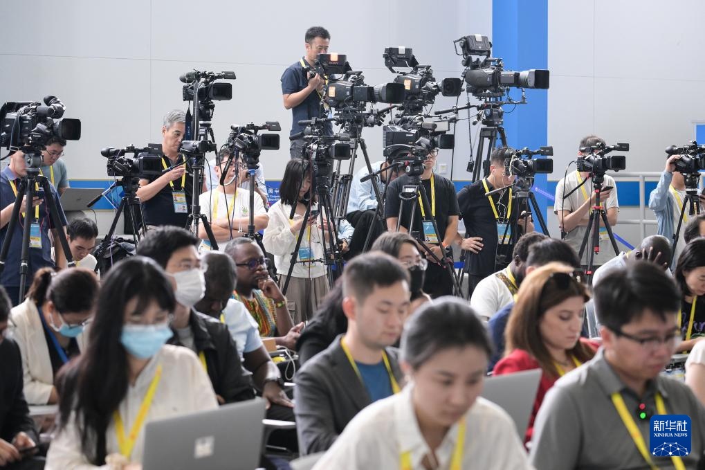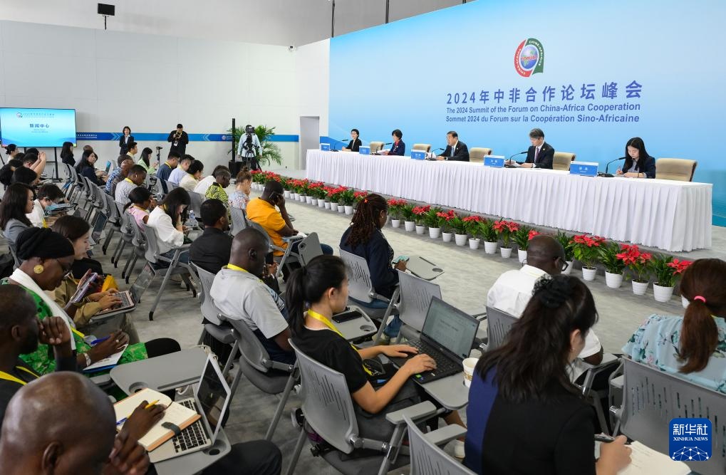 9月3日,2024年中非合作论坛峰会新闻中心举行吹风会,中国国际贸易促进委员会副会长张少刚、联络部部长林红红、中国国际商会秘书长孙晓介绍中非企业家大会和中非经贸务实合作情况,并回答记者提问。这是记者在吹风会现场采访。