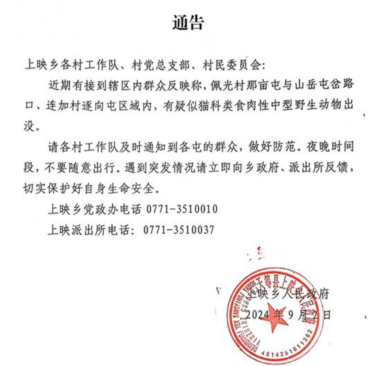据网友在短视频平台发文,广西天等县出现一只老虎。文章中还附有一张天等县上映乡政府9月2日发出的通告。通告显示,近期有接到辖区内群众反映称,佩光村那亩屯与山岳屯岔路口、连加村逐向屯区域内,有疑似猫科类食肉性中型野生动物出没。提醒群众做好防范。夜晚时间段,不要随意出行。另有网传图片称,除了发现脚印外,当地还有家畜被咬伤。