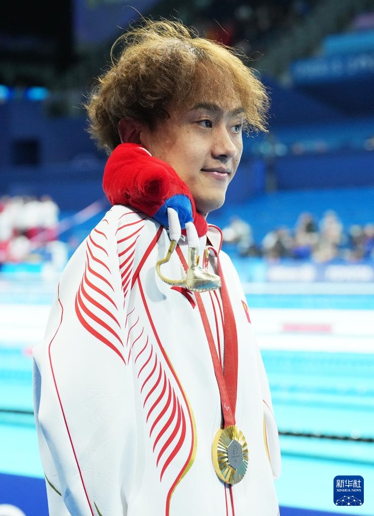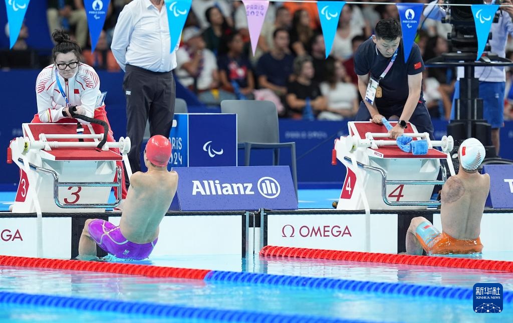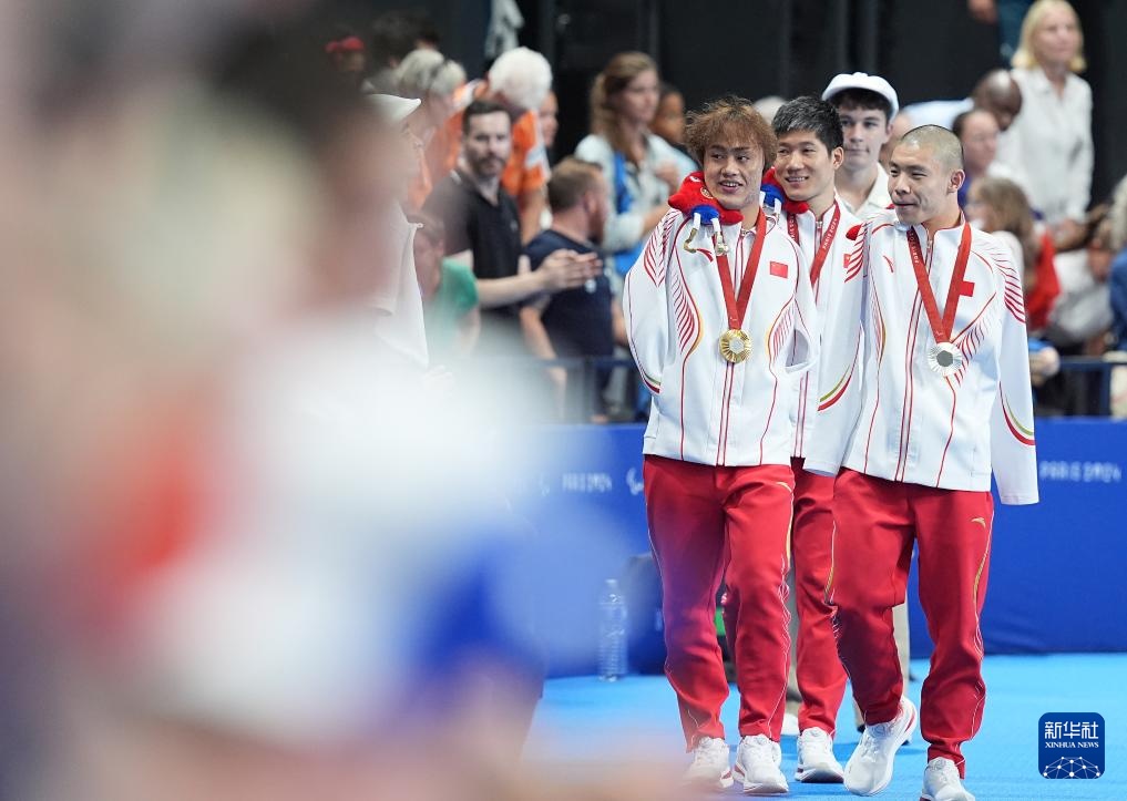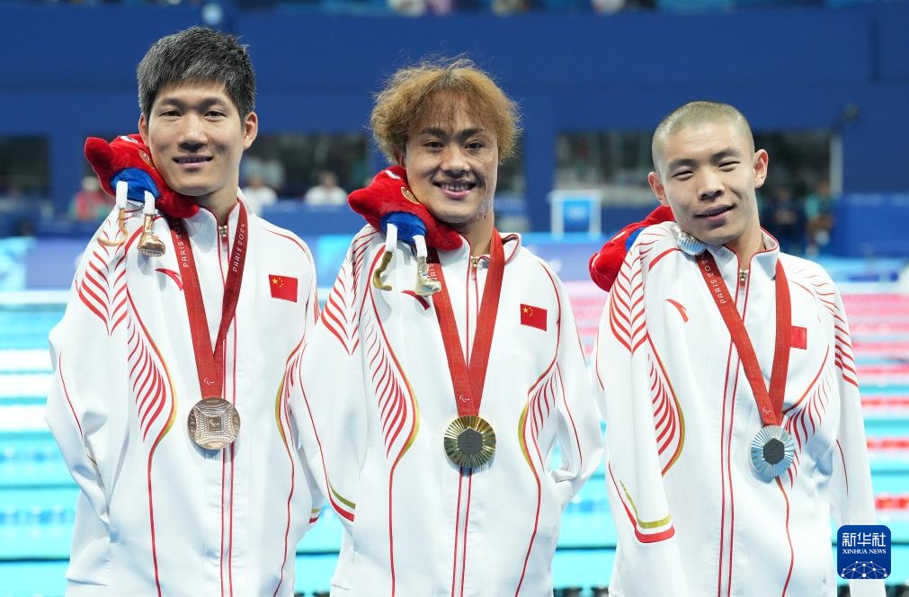 当日,在巴黎残奥会游泳男子50米仰泳S5级决赛中,中国选手袁伟译、郭金城、王李超包揽冠亚季军。