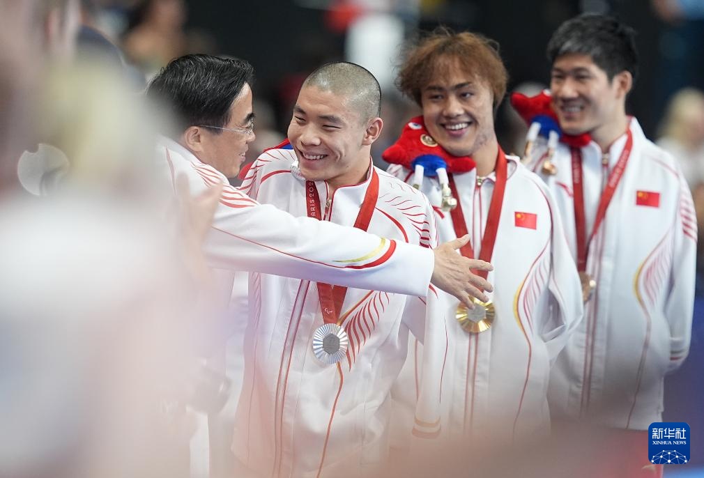 9月3日,中国残联主席程凯(左一)祝贺袁伟译(右二)、郭金城(左二)和王李超。