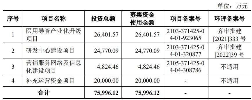 百多安原拟在上交所科创板公开发行股份数量不超过2,052万股,占发行后总股本的比例不低于25%。公司原拟募集资金75,996.12万元,用于医用导管产业化升级项目、研发中心建设项目、营销服务网络及信息化建设项目及补充运营资金项目。