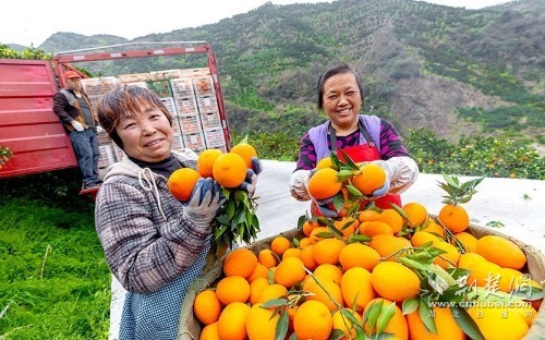 运输脐橙的货车行驶在施工便道上。湖北交投供图