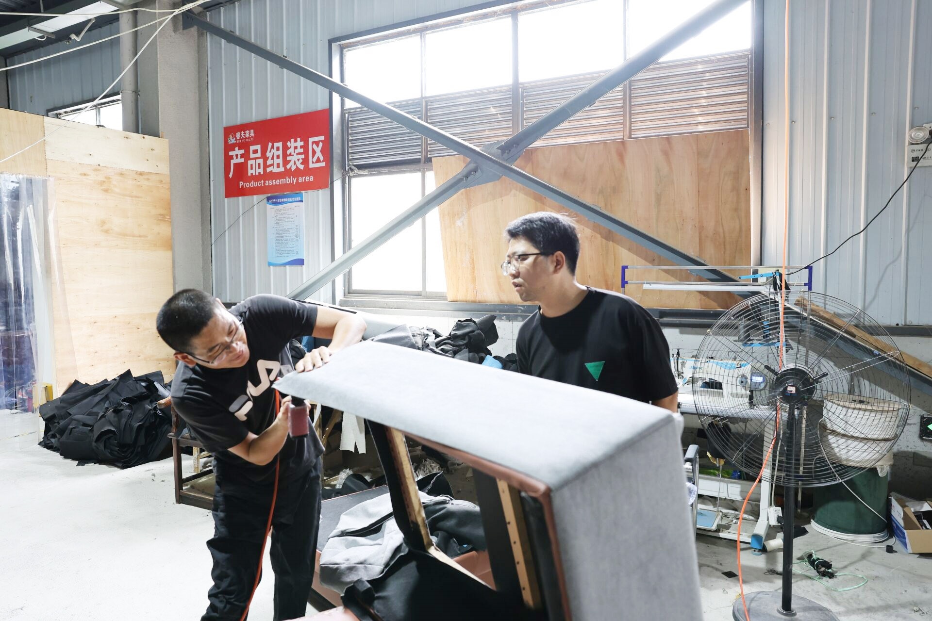 曾凡勇(左)亲手缝制沙发 通讯员供图