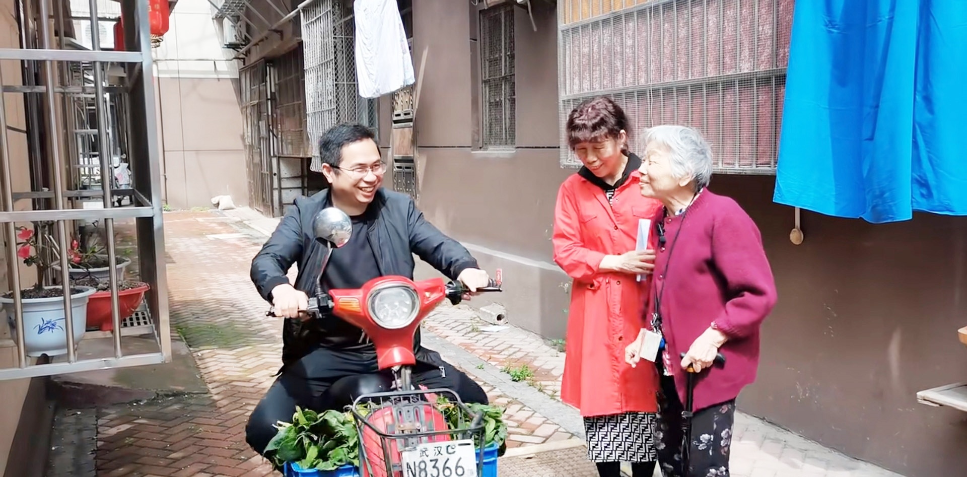 何凡(左)在采购食材回来的路上向居民问好 通讯员供图