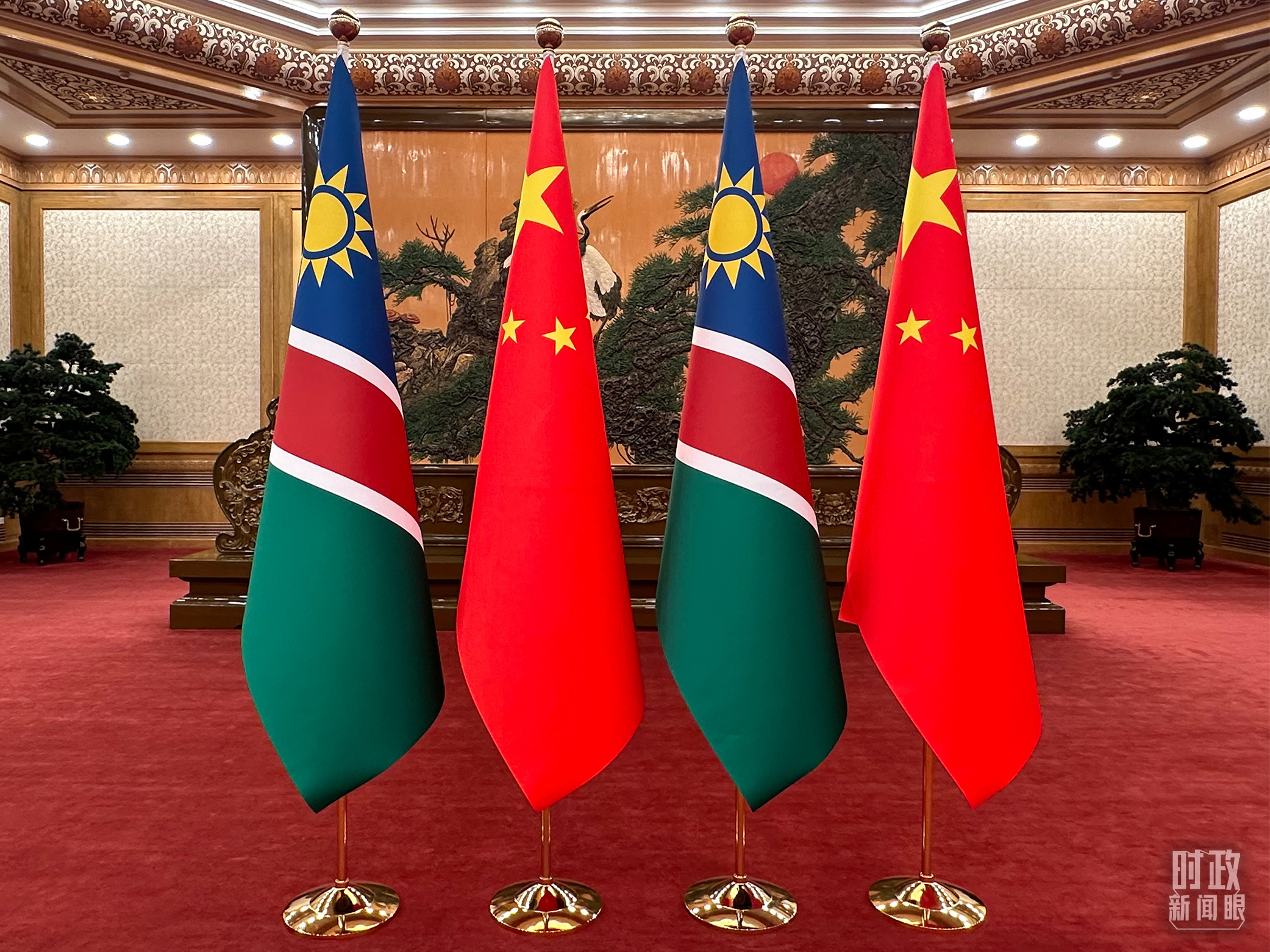 △双边会见现场的中国和纳米比亚国旗。(总台央视记者范一鸣拍摄)