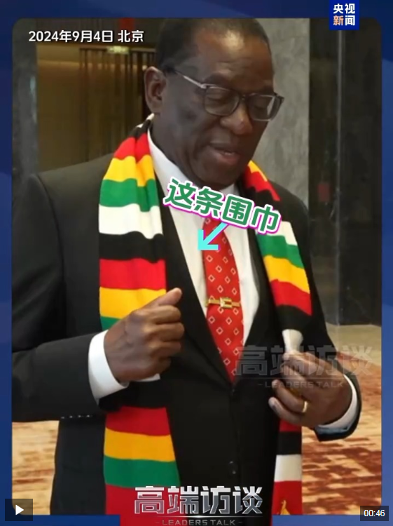 2024年中非合作论坛峰会期间,津巴布韦总统姆南加古瓦接受总台《高端访谈》独家专访。不论冬夏,他总是戴着一条津巴布韦国旗配色的围巾,这条围巾对他来说意味着什么?戳视频,了解一下~