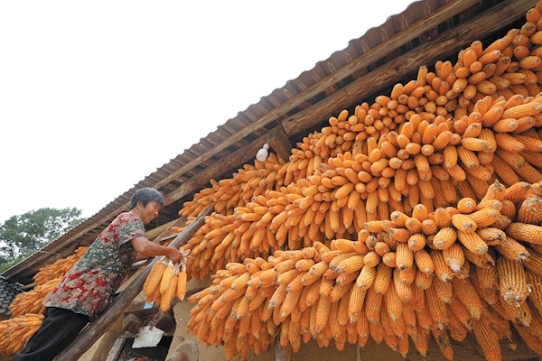 ③9月4日,房县白鹤镇堰河村村民在自家院落晾晒玉米。特约记者张启龙通讯员余杉摄