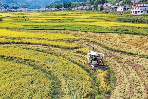①9月1日,在竹溪县中峰镇狄裕沟村,农机手驾驶收割机收割优质贡米稻谷。通讯员温大树摄