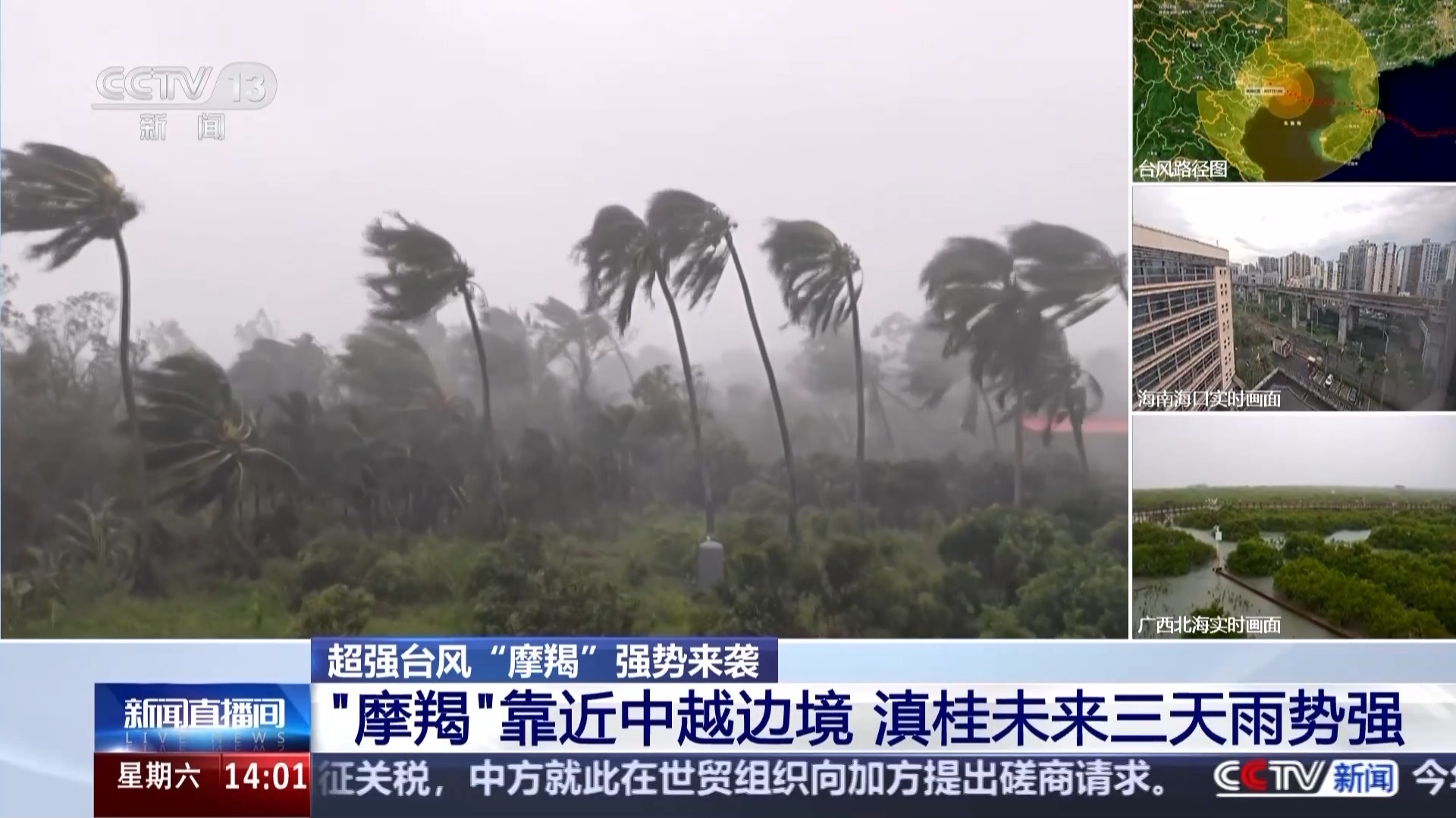 受台风“摩羯”影响,从昨天到今天,海南岛、广东、广西等地部分地区和沿海出现8~11级阵风,局地12~14级,其中海南澄迈、海口及广东湛江等局地风力达15~17级,海南文昌铜鼓岭观测到最大风力达17级以上。海南岛、广东、台湾岛、广西等地部分地区出现暴雨或大暴雨,海南海口、文昌、定安、昌江、乐东等局地出现250~477毫米的特大暴雨。