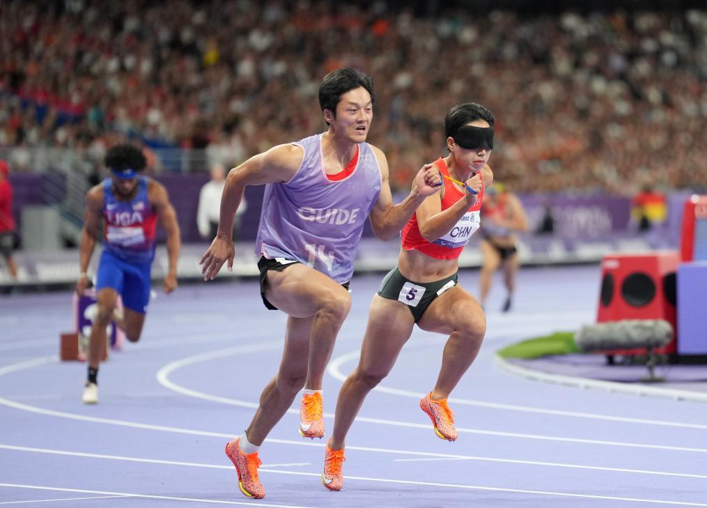 9月6日,中国队第一棒选手周国华(右)与领跑员贾登璞在比赛中。新华社记者 贺灿铃 摄