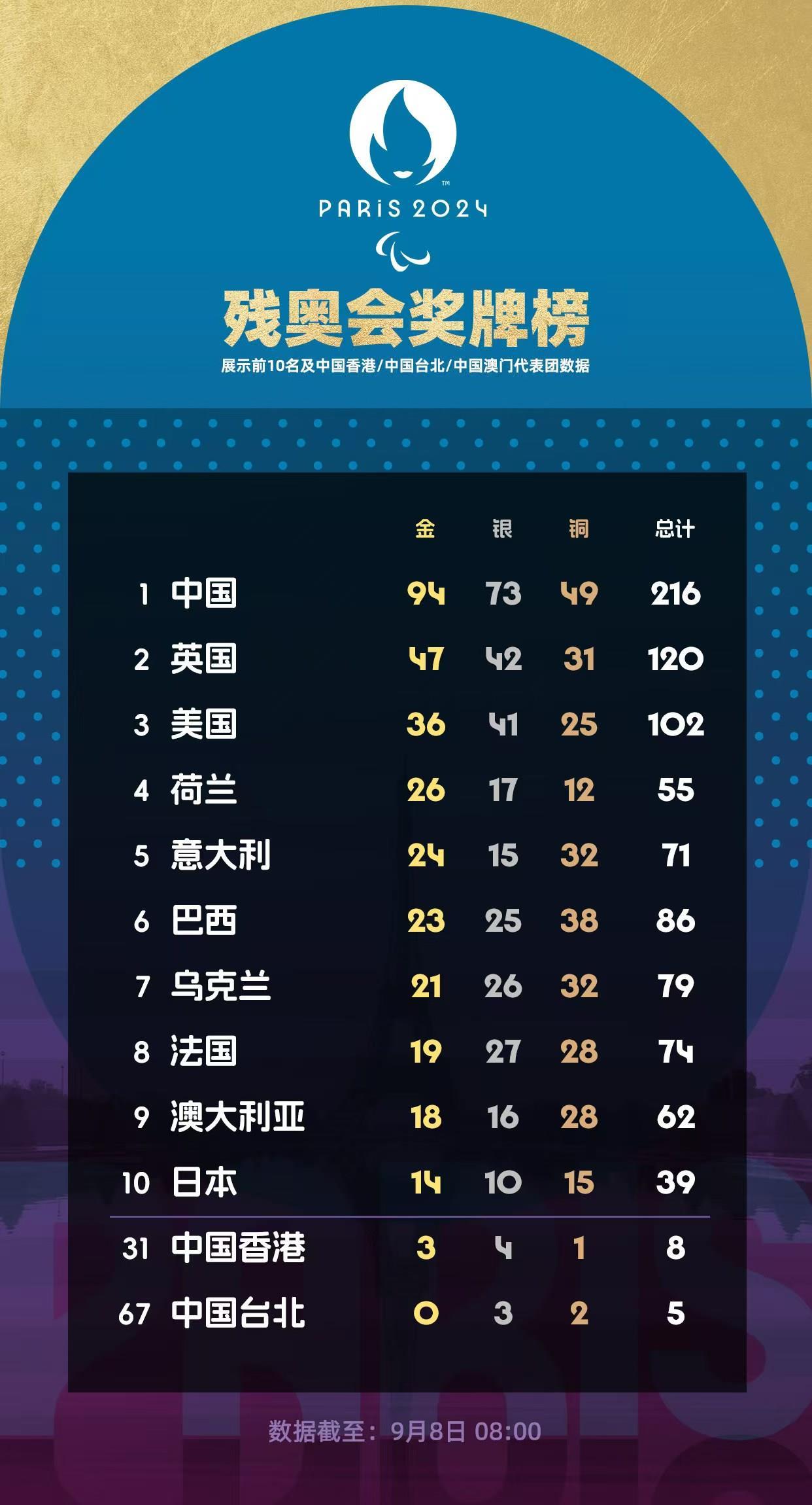 已获得216枚奖牌高居榜首