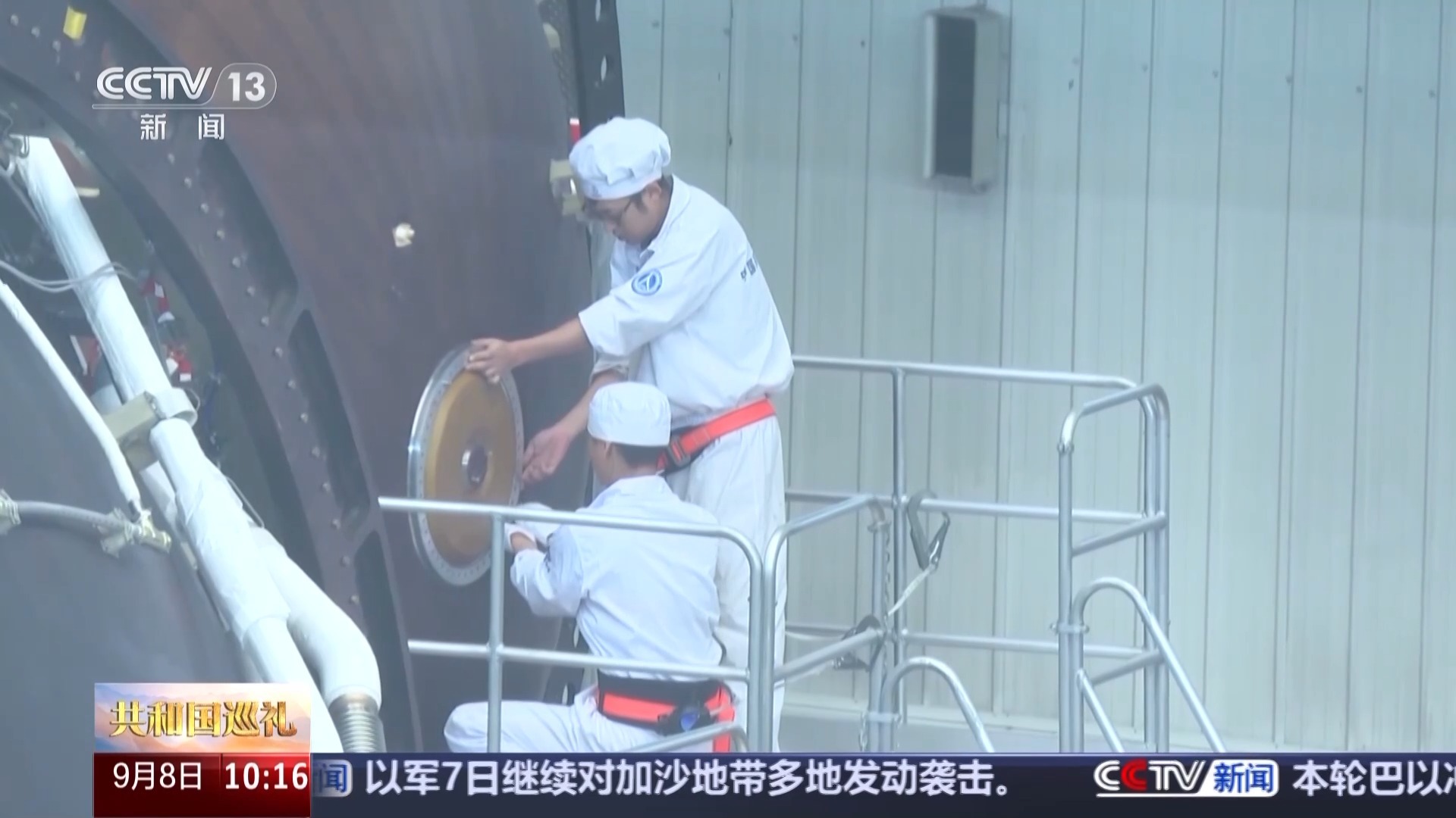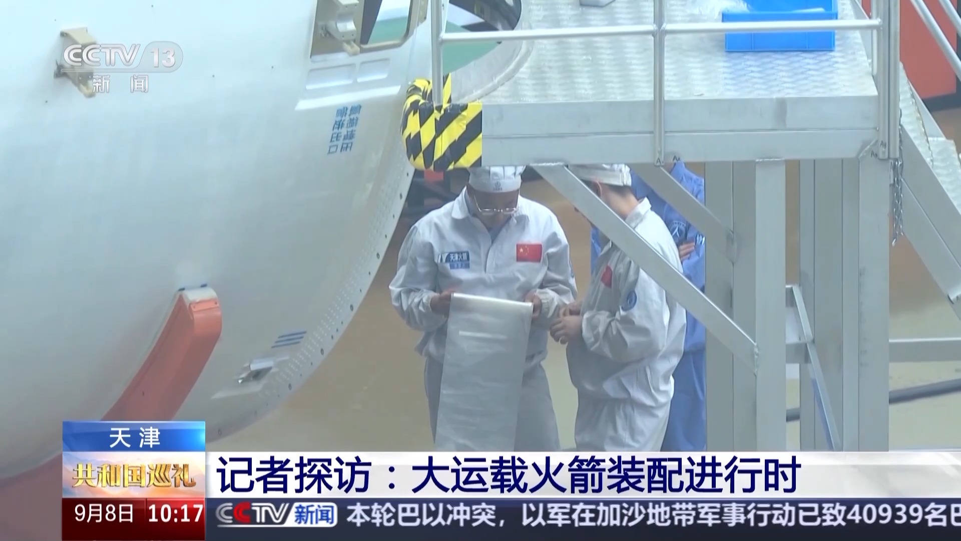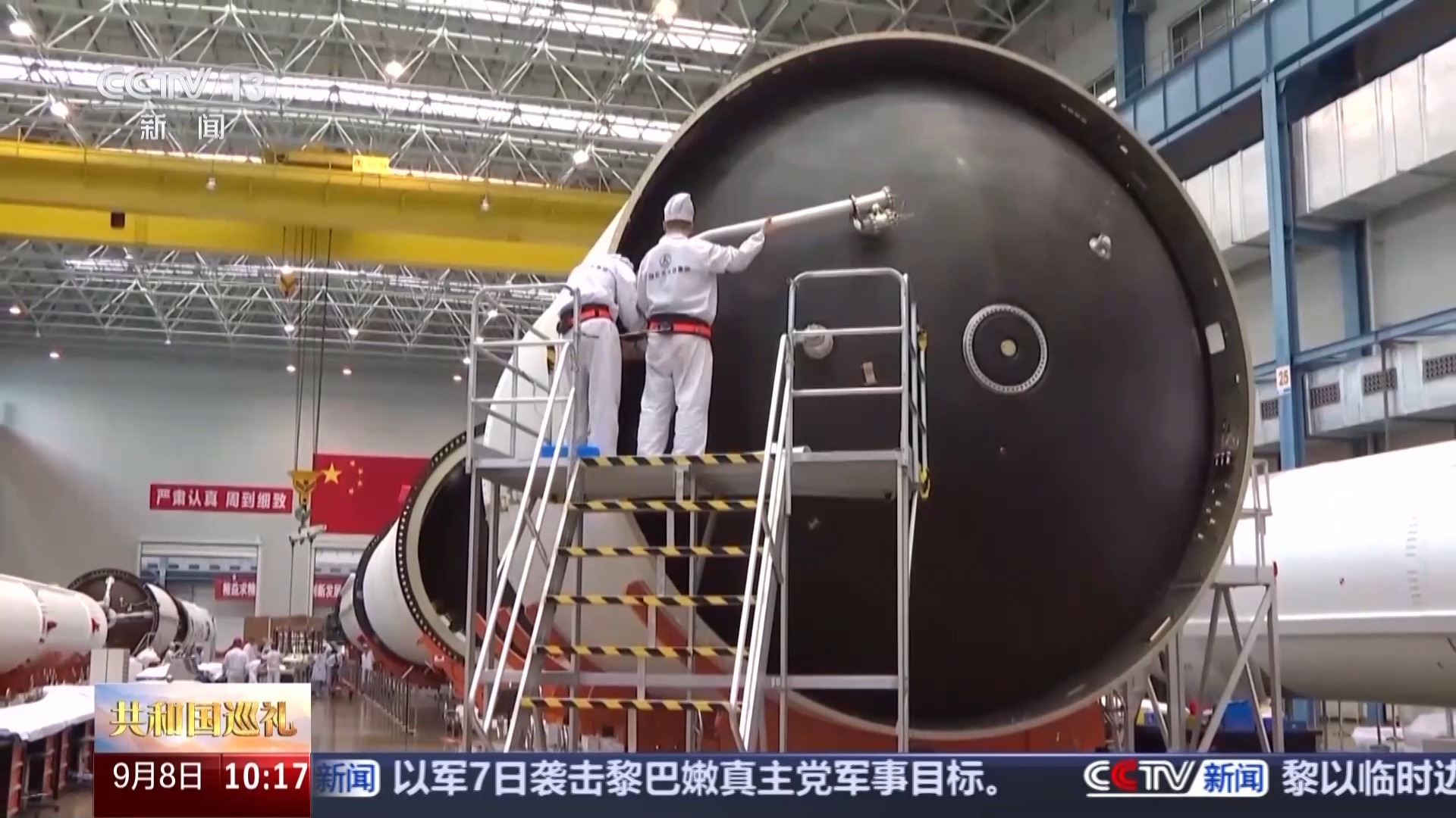 总台记者 朱辛未:我现在就是在位于天津的大运载火箭基地,在我的身后,看到的是长征五号B运载火箭的总装现场。此刻,几名工作人员正在高台上,对已完成组装的火箭部件进行检查。在近处,另外一批工作人员正参照技术标准对各个尚未组装的零部件进行核查检测工作。待一切确认无误,这些零部件将被分批组装,成为火箭的一部分。