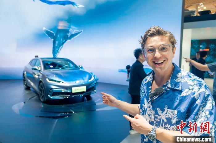 8月30日,第二十七届成都国际汽车展览会在成都开幕,图为汽车自媒体博主、“车轮哥”伊森·罗伯森在展台介绍参展车辆。 (受访者 供图)