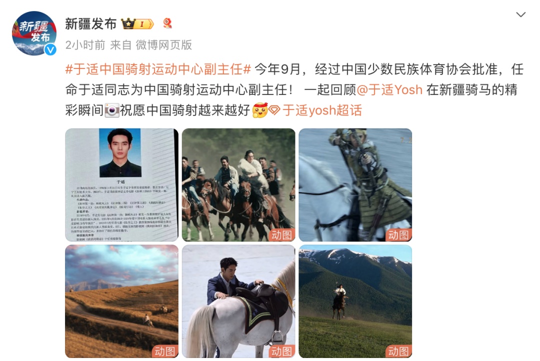 据@新疆发布 9月8日消息,今年9月,经过中国少数民族体育协会批准,任命于适同志为中国骑射运动中心副主任。