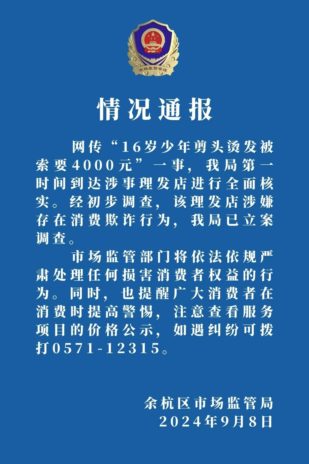 昨日(9月8日),浙江省杭州市余杭区市场监管局发布通报:网传“16岁少年剪头烫发被索要4000元”一事,经初步调查,该理发店涉嫌存在消费欺诈行为,已立案调查。