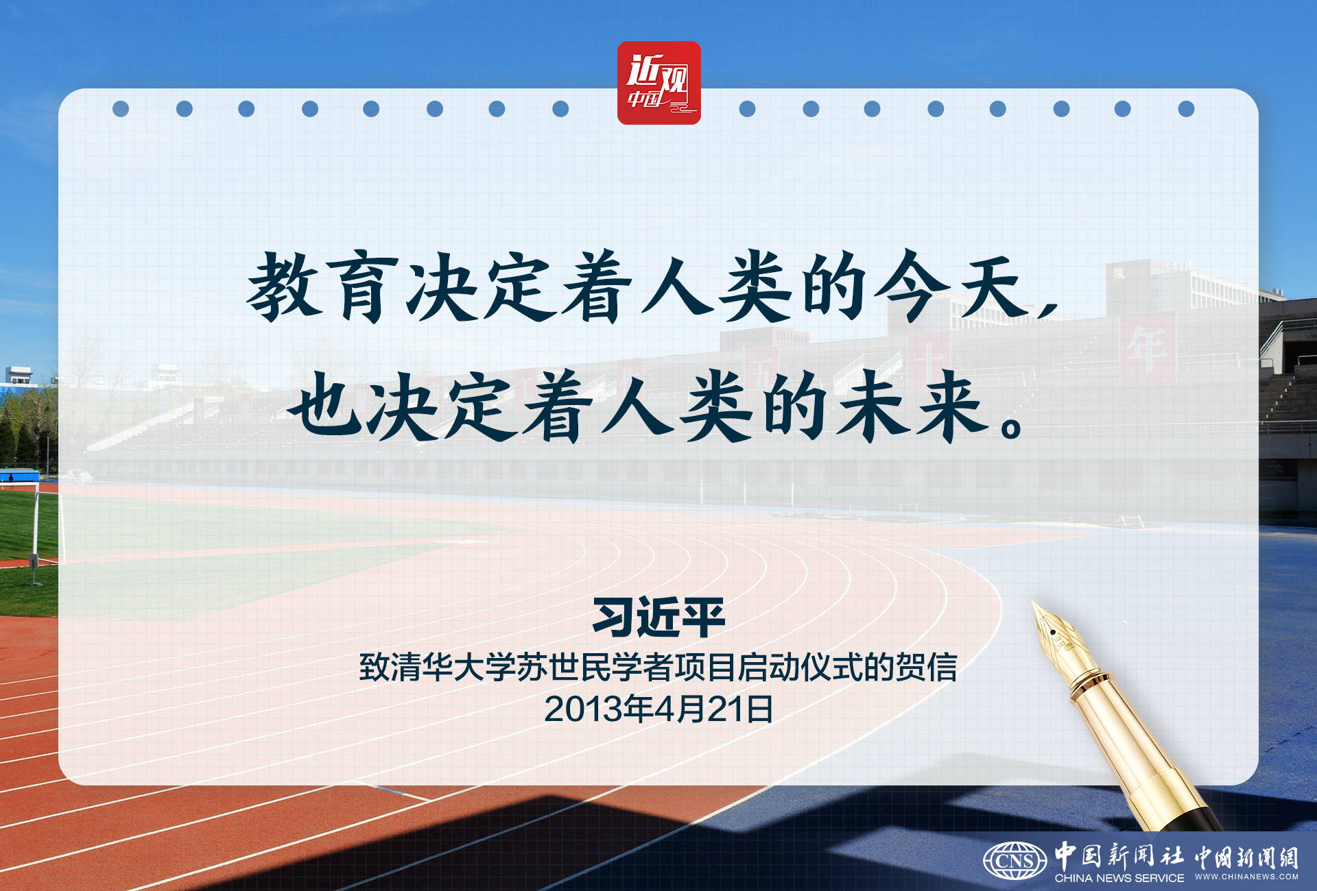 2013年4月21日,清华大学苏世民学者项目启动仪式在北京举行。中国国家主席习近平致贺信。习近平在贺信中指出,教育决定着人类的今天,也决定着人类的未来。人类社会需要通过教育不断培养社会需要的人才,需要通过教育来传授已知、更新旧知、开掘新知、探索未知,从而使人们能够更好认识世界和改造世界、更好创造人类的美好未来。