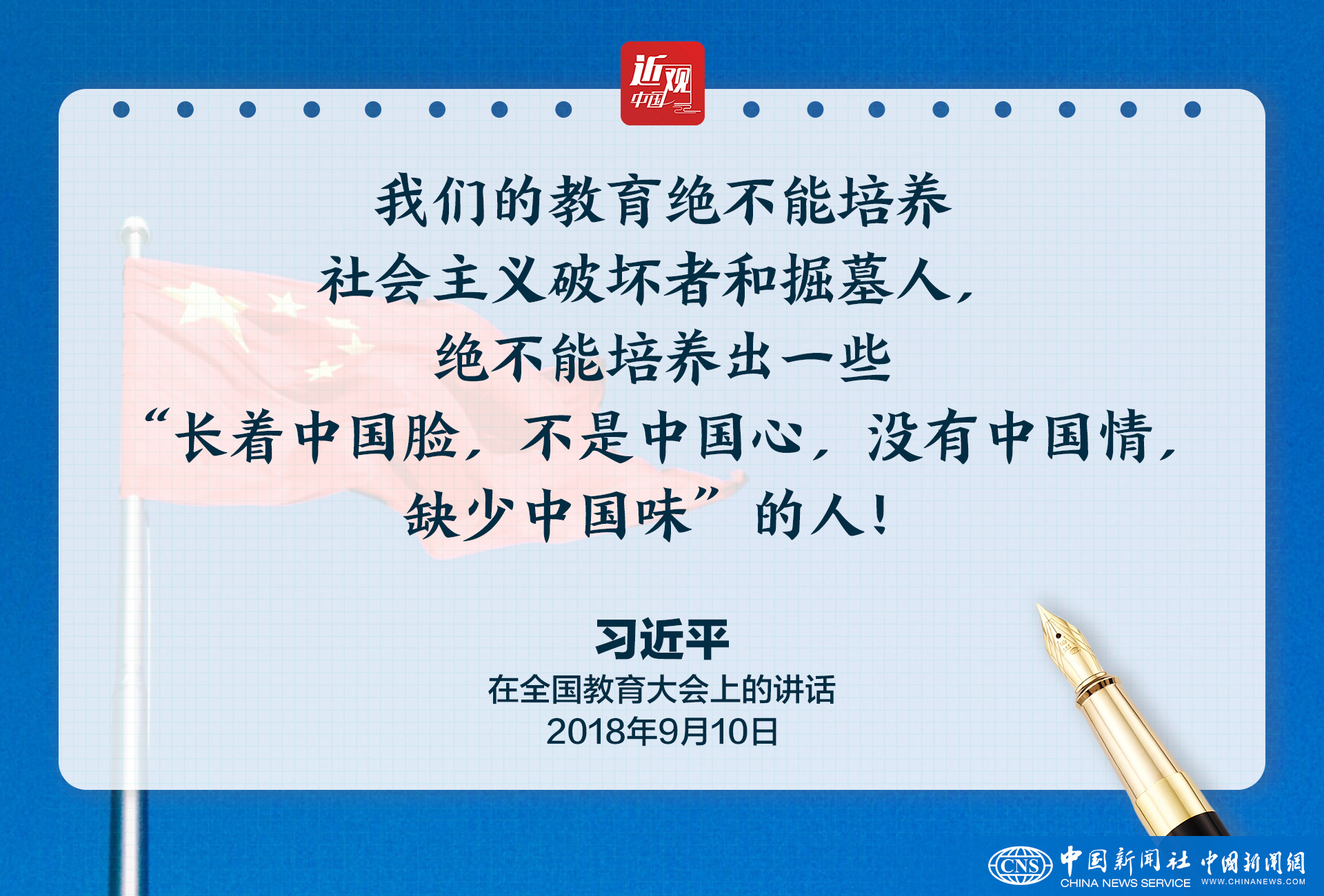 习近平指出,培养什么人,是教育的首要问题。古人云:“国有贤良之士众,则国家之治厚;贤良之士寡,则国家之治薄。”从历史和现实的角度看,任何国家、任何社会,其维护政治统治、维系社会稳定的基本途径无一不是通过教育。我国是中国共产党领导的社会主义国家,这就决定了我们的教育必须把培养社会主义建设者和接班人作为根本任务,培养一代又一代拥护中国共产党领导和我国社会主义制度、立志为中国特色社会主义奋斗终身的有用人才。我们的教育绝不能培养社会主义破坏者和掘墓人,绝不能培养出一些“长着中国脸,不是中国心,没有中国情,缺少中国味”的人!那将是教育的失败。教育的失败是一种根本性失败。我们决不能犯这种历史性错误!这是推进教育现代化、建设教育强国必须把握的大是大非问题,没有什么可隐晦、可商榷、可含糊的。
