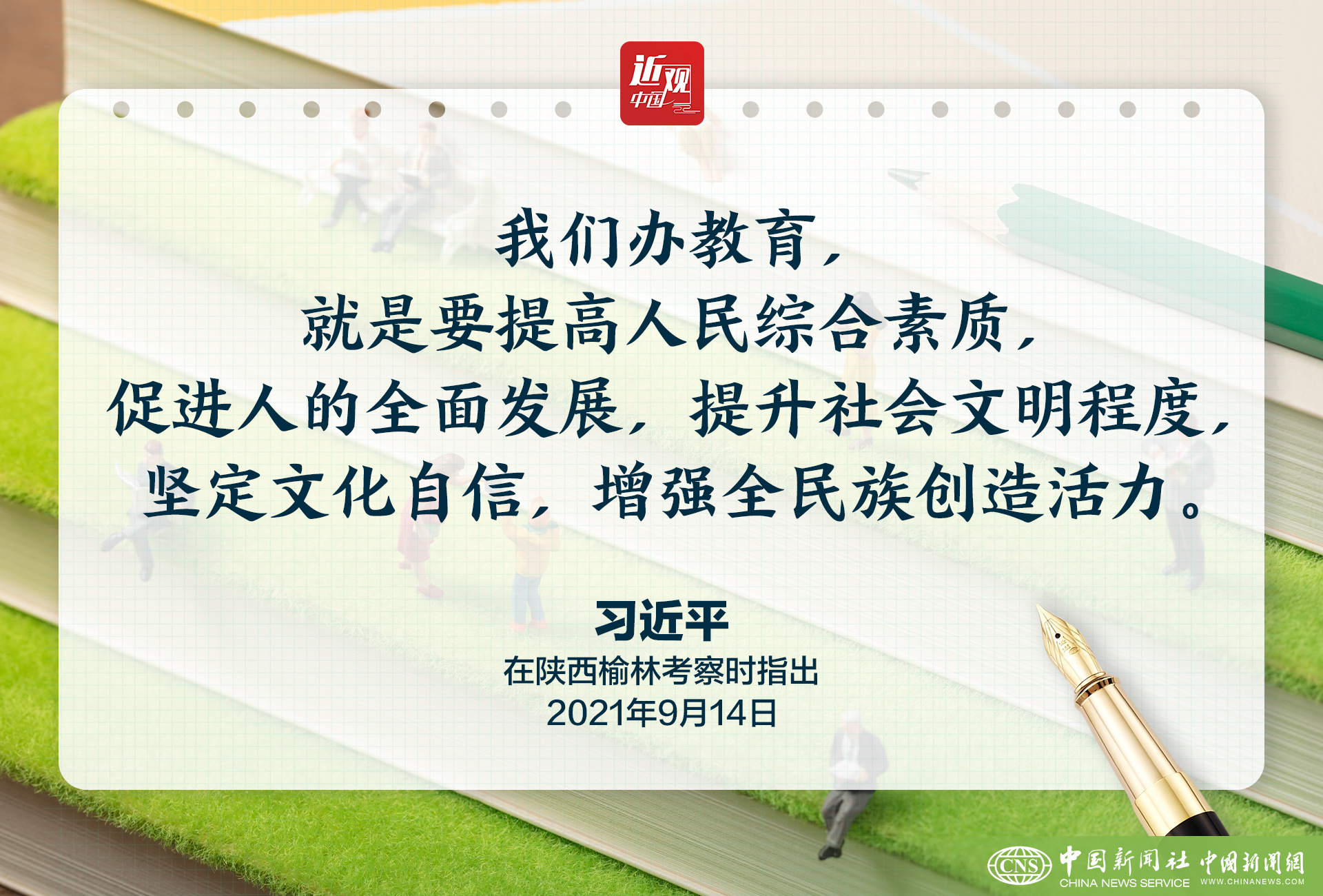 9月14日,习近平来到绥德实验中学,先后走进教室、操场,观看同学们书法练习和体育锻炼,同大家亲切交流。他指出,中华文明源远流长、绵延不断,基础在教育。实现中华民族伟大复兴,基础在教育。我们办教育,就是要提高人民综合素质,促进人的全面发展,提升社会文明程度,坚定文化自信,增强全民族创造活力。要全面贯彻党的教育方针,落实立德树人根本任务,厚植爱党、爱国、爱人民、爱社会主义的情感,努力培养德智体美劳全面发展的社会主义建设者和接班人。要深化教育教学改革,强化学校教育主阵地作用,全面提高学校教学质量,真正把过重的学业负担和校外培训负担减下来,办好人民满意的教育。