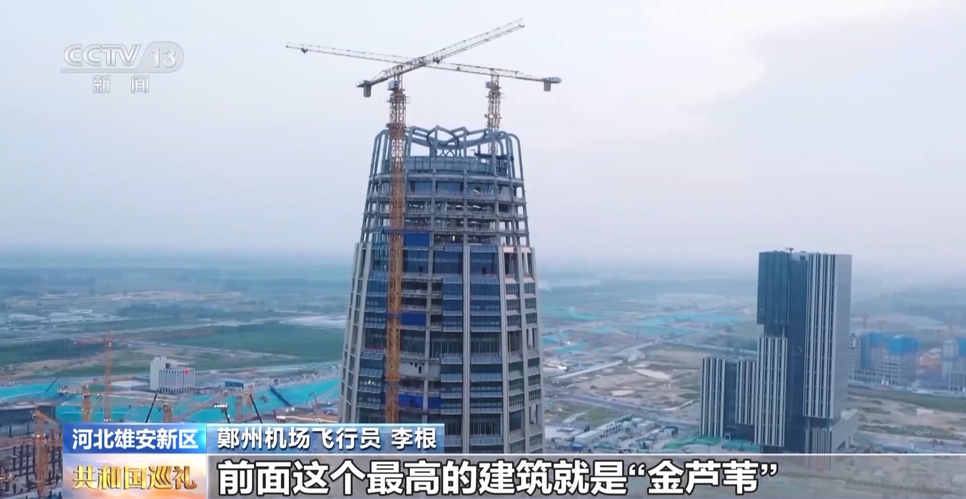 雄安新区鄚州机场飞行员 李根:现在我们的飞机来到了雄安国贸中心的上空,前面这个最高的建筑就是“金芦苇”。