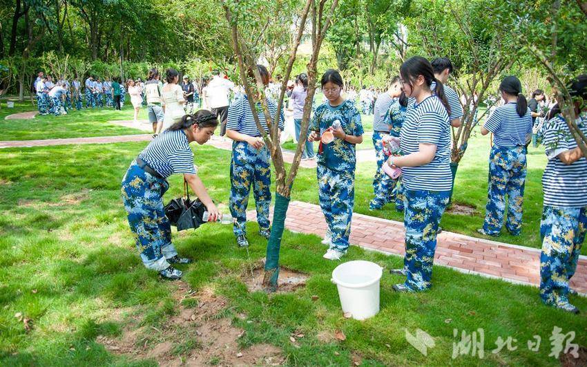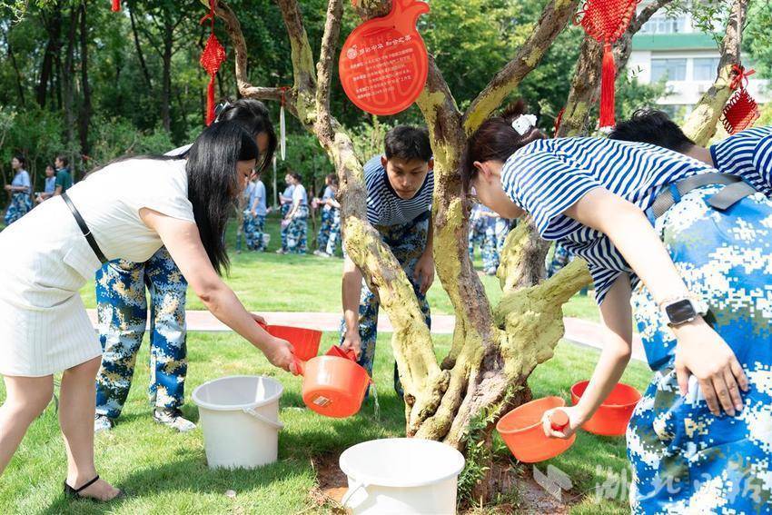 该校副校长李红燕代表全校教职员工,将来自祖国各地、象征着全体师生铸牢中华民族共同体意识的“团结之水”浇灌在石榴树下,新生们也依次将自己带来的家乡水浇灌在石榴林中。