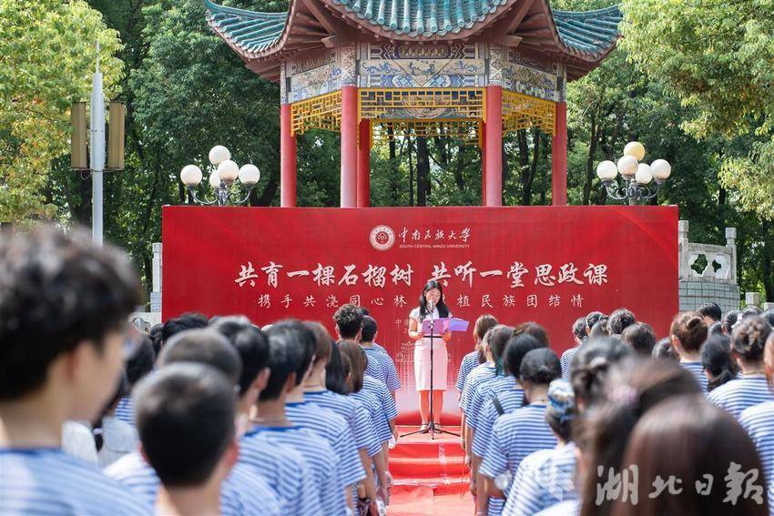 湖北日报讯(记者韩晓玲、通讯员邓思彤、辛志强)9月8日,来自全国各地的180余名各民族新生代表汇聚在中南民族大学石榴园中,一起共育一棵石榴树,把象征着中华民族“团结之水”浇灌在石榴树下,以此开展“铸牢中华民族共同体意识教育”主题的开学第一课。