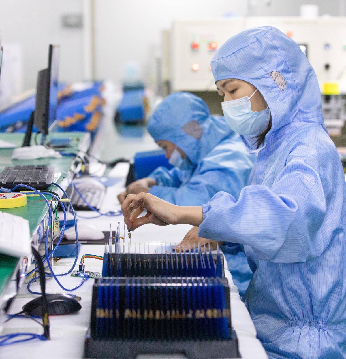 黄石大冶湖高新区,湖北信永辉电子科技有限公司员工在无尘车间内赶制订单。(湖北日报全媒记者 薛婷 摄)