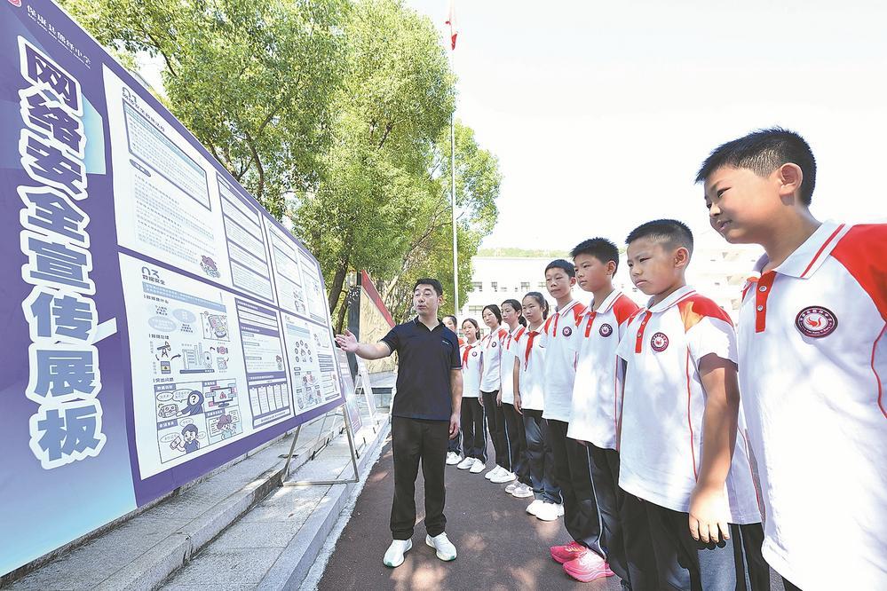 9月9日,在保康县熊绎中学,教师带领学生观看网络安全宣传展板。