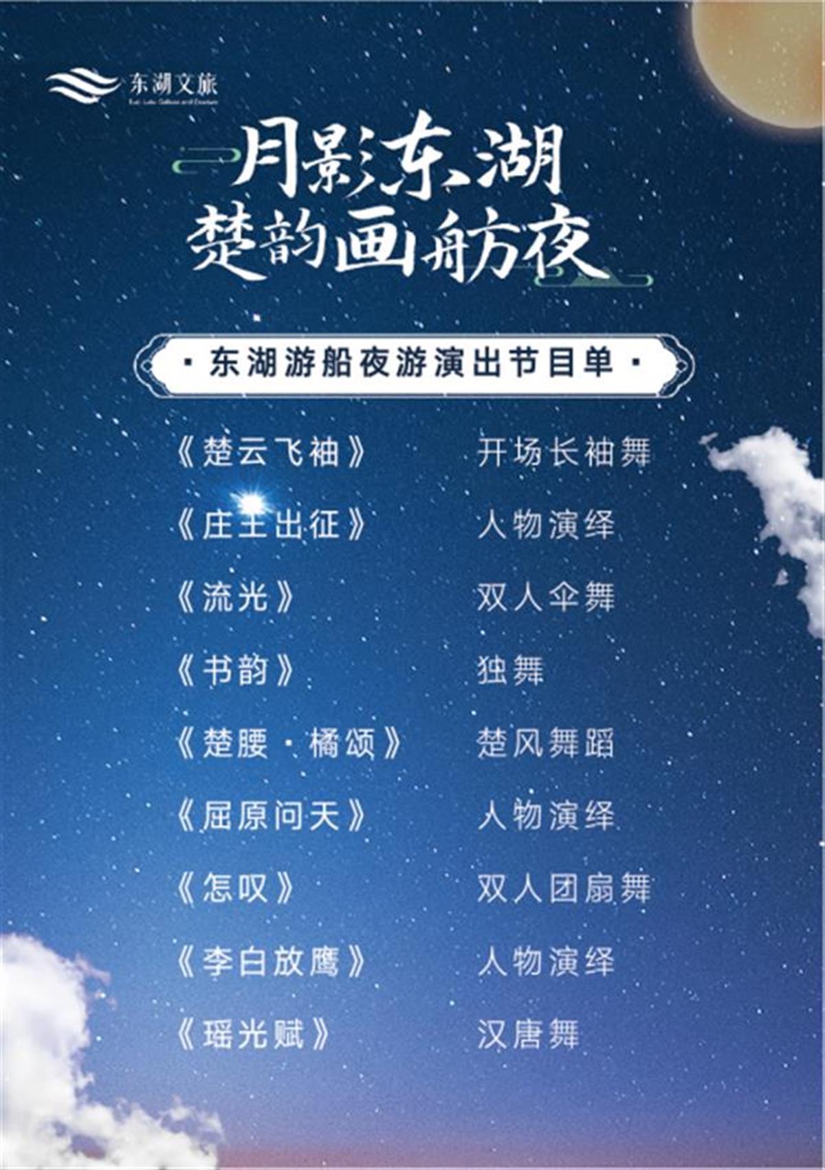 即日起至10月,每周三至周日晚7时,“月影东湖 楚韵画舫夜”夜游船将从东湖绿道楚风园码头启航,表演船与游客船并行,沿东湖绿道湖岸线巡游至东湖之眼附近往返。约50分钟的行程中,游客能一边品尝中秋月饼、茶水小吃,一边近距离欣赏中秋、国庆特别推出的三大文化演绎节目——《庄王出征》《屈原问天》《李白放鹰》。