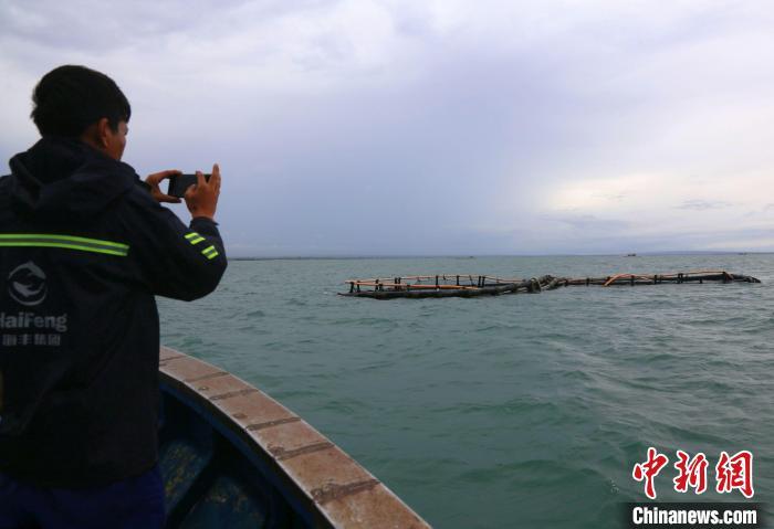 9月11日,海南临高后水湾一带的深水网箱。超强台风“摩羯”给海南农业带来逾百亿元人民币经济损失,其中渔业经济损失占比过半。台风过后,养殖渔民通过潜水等方式,详细查验深水网箱的受损状况,为后续的维修工作做准备。图为一口原本是“o”形的网箱,被台风刮成了“8”形。中新社记者 王晓斌 摄