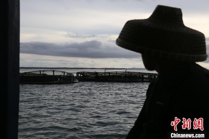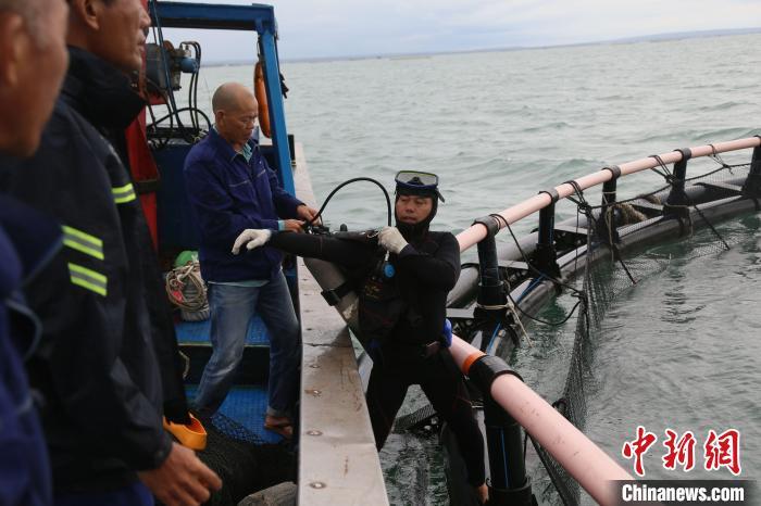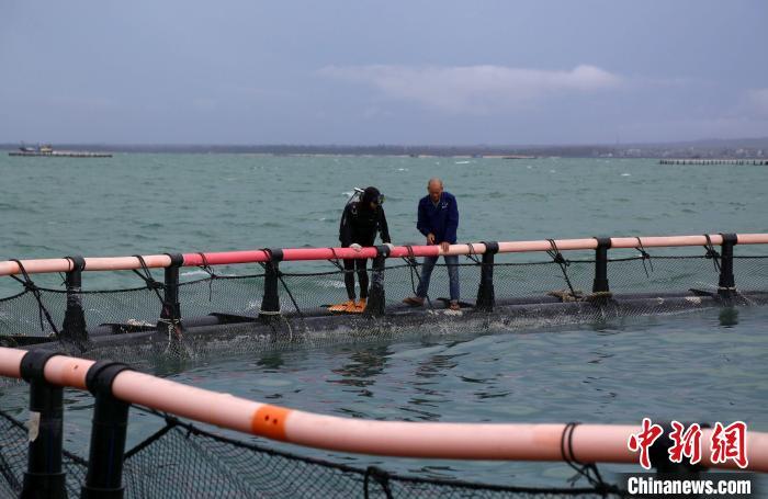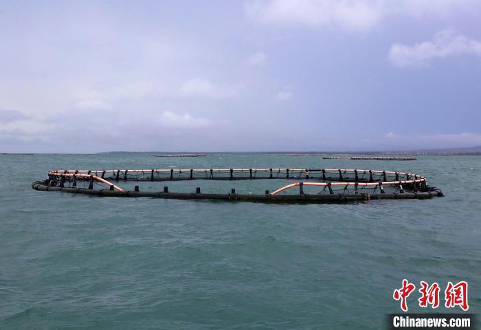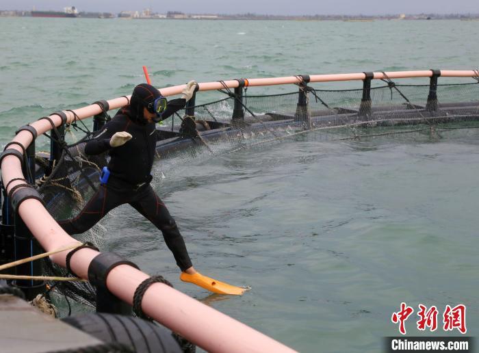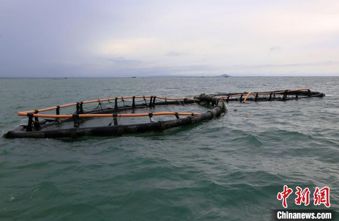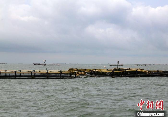 9月11日,海南临高后水湾一带的深水网箱。超强台风“摩羯”给海南农业带来逾百亿元人民币经济损失,其中渔业经济损失占比过半。台风过后,养殖渔民通过潜水等方式,详细查验深水网箱的受损状况,为后续的维修工作做准备。中新社记者 王晓斌 摄