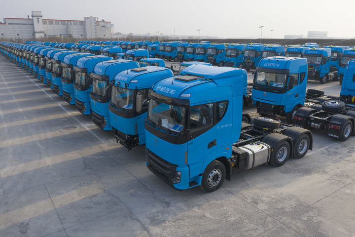 这是2024年4月1日在位于山西省晋中市榆次区的山西新能源汽车工业有限公司(吉利晋中基地)拍摄的甲醇重卡(无人机照片)。新华社记者 杨晨光 摄