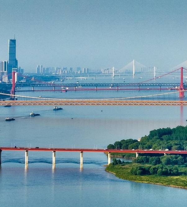 从高空俯瞰长江武汉段,水清岸美,6座跨江大桥尽收眼底。(湖北日报全媒记者 柯皓 摄)