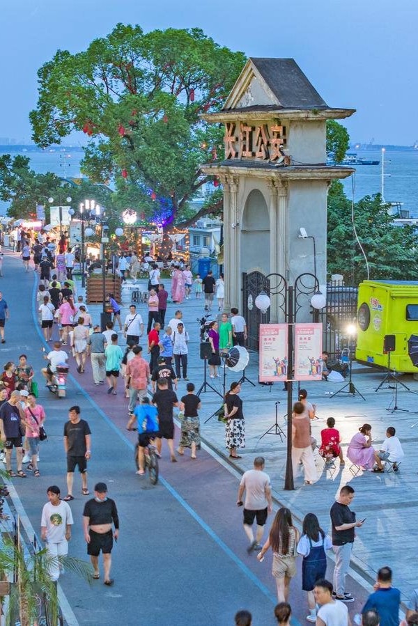 荆州沙市区荆江边洋码头段热闹非凡,游步道上游人如织。沙市洋码头片区改造是荆江沙市段生态修复工程的核心项目。昔日废弃老厂房、破败旧建筑如今已成为长江沿岸靓丽的文旅名片。(湖北日报全媒记者 刘曙松 摄)