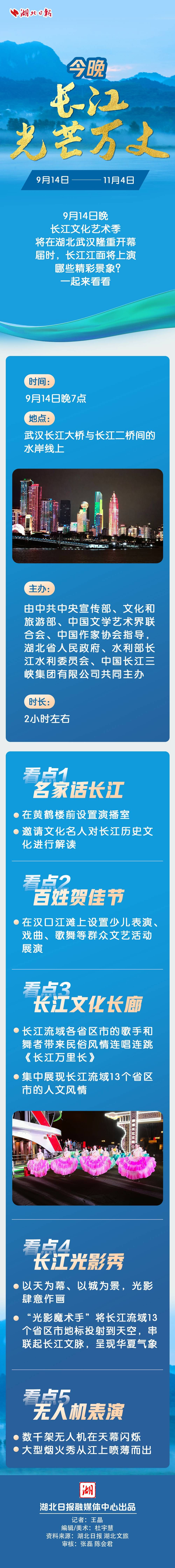 湖北日报讯 (记者王晶)喝过长江水的人,总有一条大江在心中流淌;家住长江边的人,总有一条大江在灵魂深处激荡。今晚,由中共中央宣传部、文化和旅游部、中国文学艺术界联合会、中国作家协会指导,湖北省人民政府、水利部长江水利委员会、中国长江三峡集团有限公司共同主办的长江文化艺术季将正式拉开帷幕。长江流域13省区市在江城武汉携手,共同奏响长江文化艺术季的崭新乐章,乐章的序幕将由全城锦绣、一江璀璨的开幕式拉开。