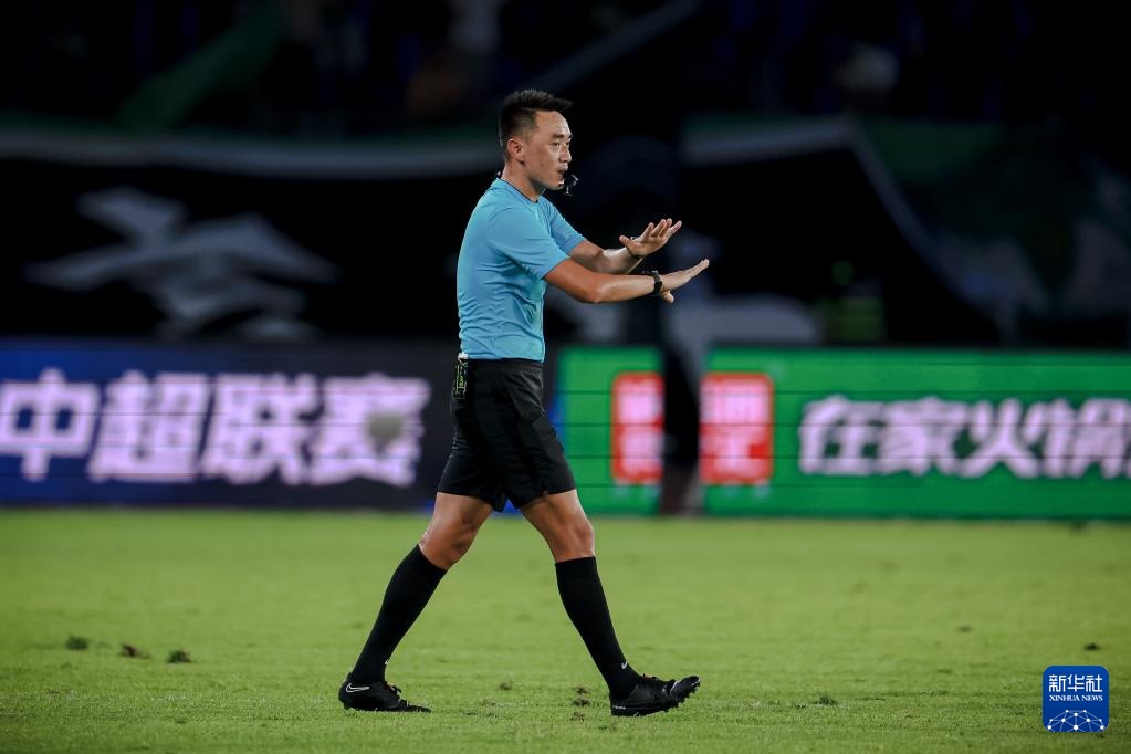 9月13日,主裁判杜健鑫在经过VAR(视频助理裁判)回放后判定浙江队在补时阶段的进球无效。新华社记者 江汉 摄