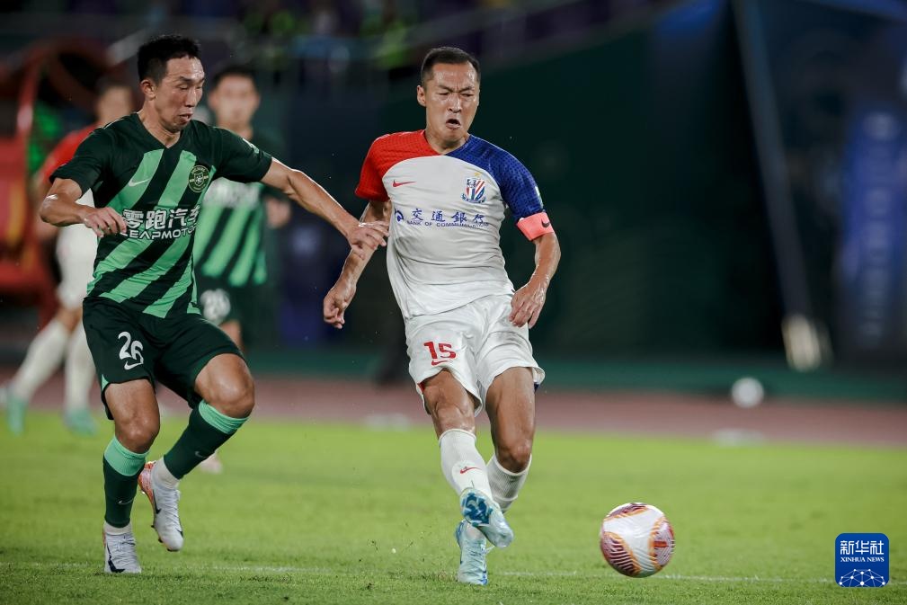 9月13日,上海申花队球员吴曦(右)在比赛中射门得分。新华社记者 江汉 摄