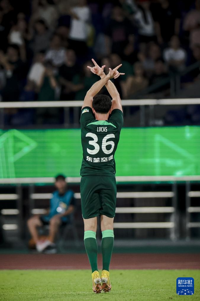 9月13日,浙江队球员卢卡斯在补时阶段进球后庆祝。随后,该进球经过VAR(视频助理裁判)回放后判定无效。新华社记者 江汉 摄