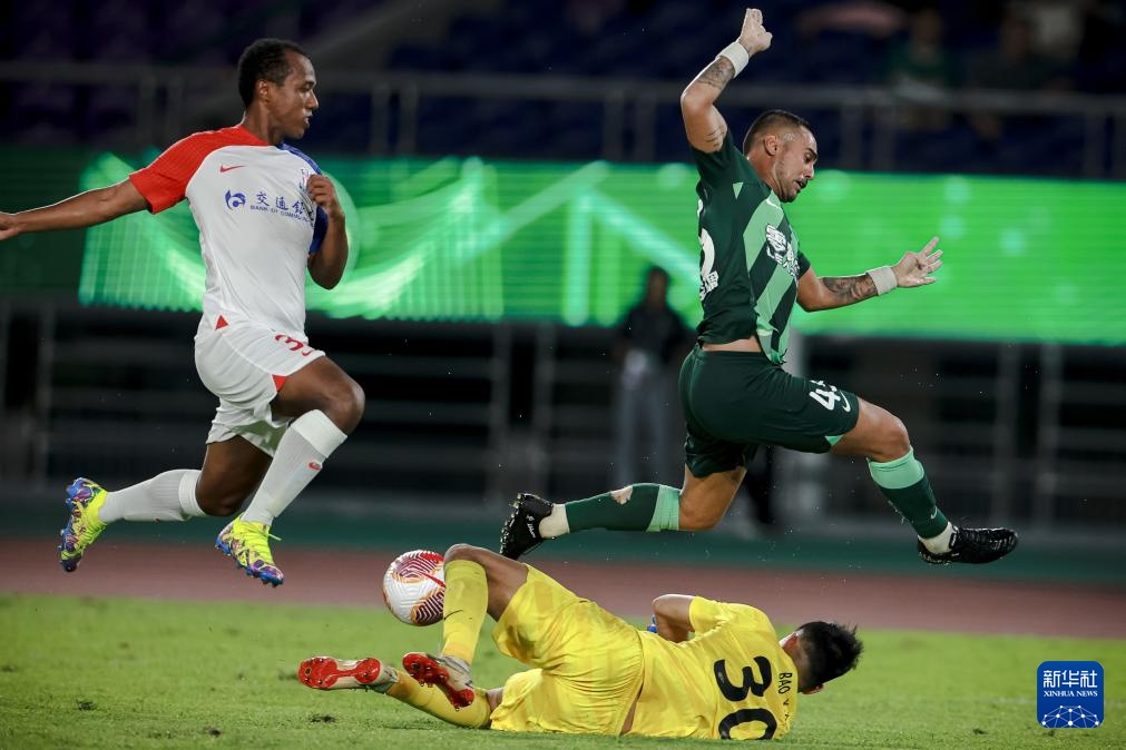 9月13日,上海申花队守门员鲍亚雄(下)在比赛中扑救。新华社记者 江汉 摄