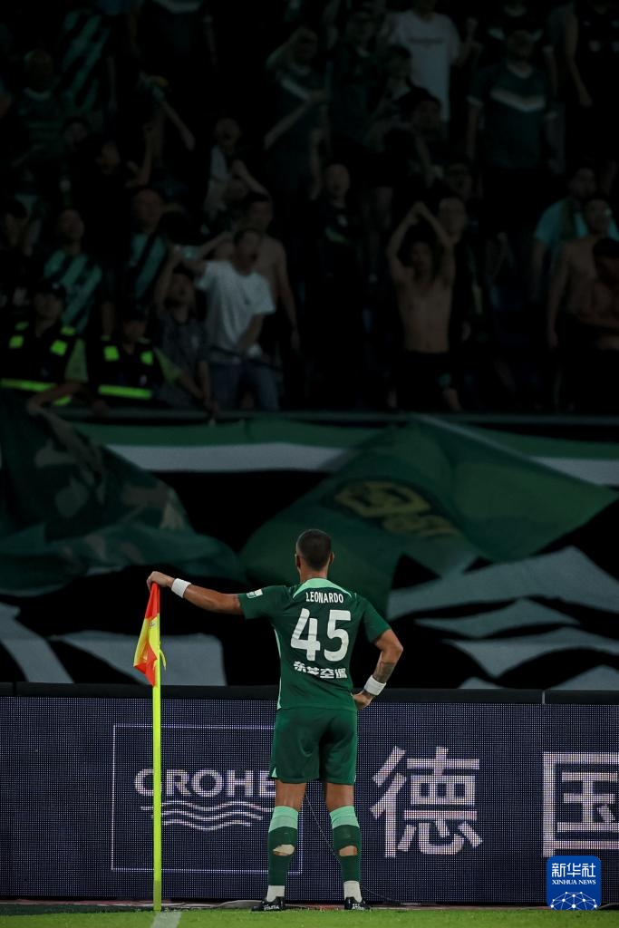 9月13日,浙江队球员莱昂纳多进球后庆祝。新华社记者 江汉 摄