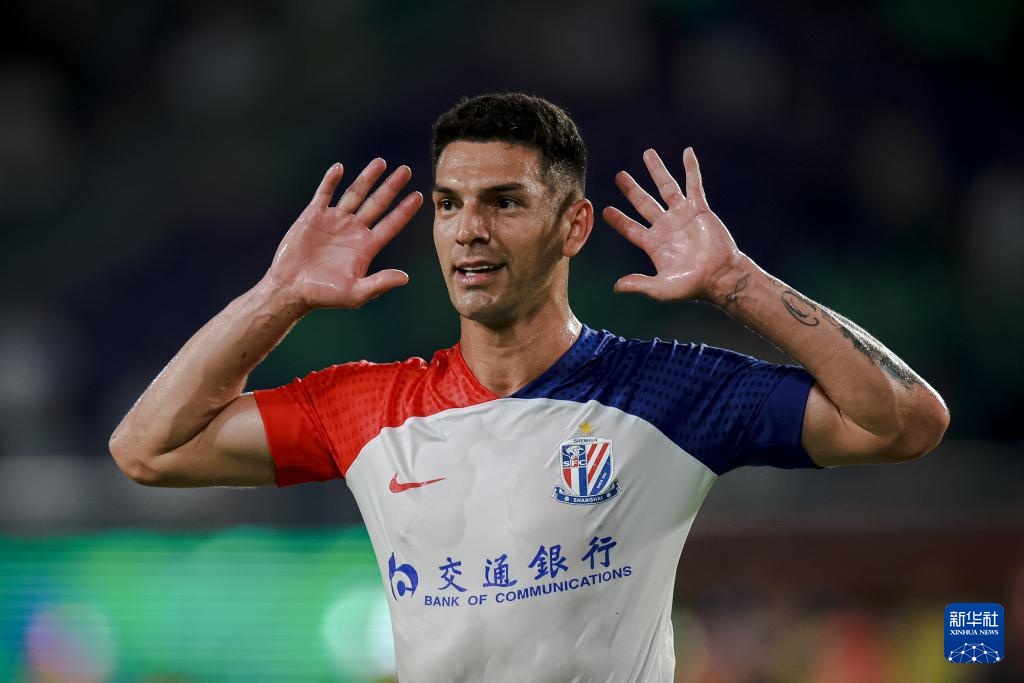 9月13日,上海申花队球员安德烈·路易斯进球后庆祝。新华社记者 江汉 摄